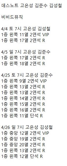 4/25 토 7시 고은성 김준수 1층 왼쪽 13열 2연석 R 1층 왼쪽 13열 2연석 R 1층 왼쪽 14열 2연석 R 1층 왼쪽 15열 2연석 R 1층 왼쪽 16열 2연석 R 4/26 일 7시 고은성 김성철 1층 중앙 20열 단석 R 1층 왼쪽 13열 2연석 R 1층 왼쪽 12열 단석 R