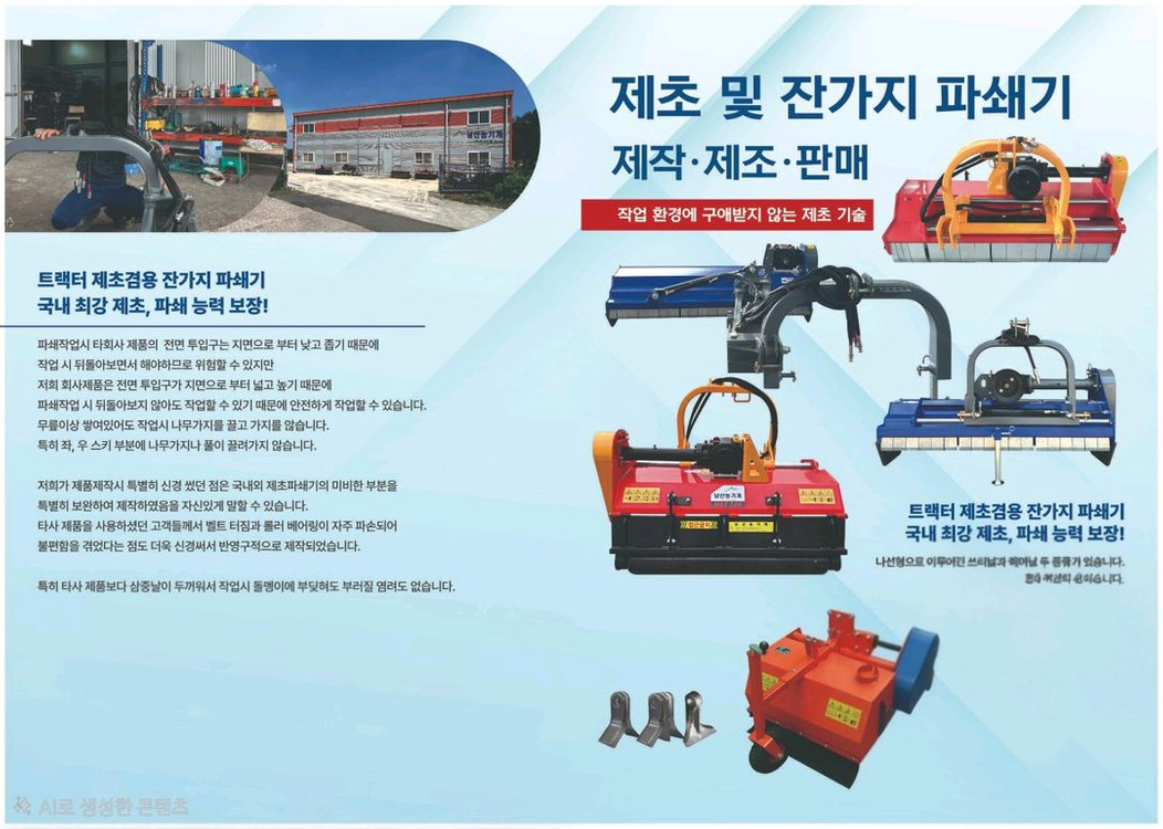 ★★새제품 국산 트랙터 제초겸용 잔가지 파쇄기 소개합니다 ★★ 국산 트랙터 제초겸용 잔가지 파쇄기입니다 국내 최고 제초, 파쇄 능력보장합니다 여러가지 모델이 규격별로 있습니다 경운기용도 있으니 별도문의주세요 국내에서 제작하여 판매한 제품이오니 믿고 구매하셔도 됩니다 영상 자료 요청시 보내 드림니다 판매가 별도문의 직접방문구매또는 전국화물운송가능(운송비별도)
