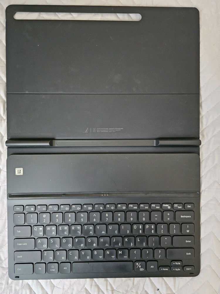 삼성 정품 키보드 케이스예요. 사용감은 있지만 기능상 문제없이 잘 작동합니다. 태블릿과 함께 사용하면 노트북처럼 활용 가능해요.