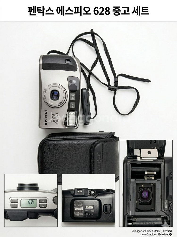 사진 보시다시피 외관 상태 아주 훌륭한 펜탁스 에스피오 모델입니다. 구성품까지 잘 갖춰진 세트라 바로 사용하시거나 소장하시기에도 좋습니다. 입문용으로도 워낙 유명하고 결과물도 감성적으로 잘 나오는 모델이라 빠르게 처분하고자 합니다. • 플래시: 광량 일정하고 아주 잘 터집니다. (굿) • 타이머: 작동 이상 없이 정확하게 작동합니다. (굿) • 렌즈: 깨끗합니다. (굿) • 뷰파인더: 먼지 적고 깨끗해서 아주 잘 보입니다. (굿) • 데이터백: 날짜 각인 기능 정상 작동 중입니다. 📦 구성품 • 카메라 본체 • 전용 가죽 케이스 • 전용 리모컨 • 목걸이 스트랩 💬 한마디 몇만원 싼거 샀다가 애착도 안가고 나중에 시간 돈만 더 듭니다. 작동 잘 되는 확실한 기기 찾으시는 분들께 추천드려요. 급매라 가격 합리적으로 올렸습니다.