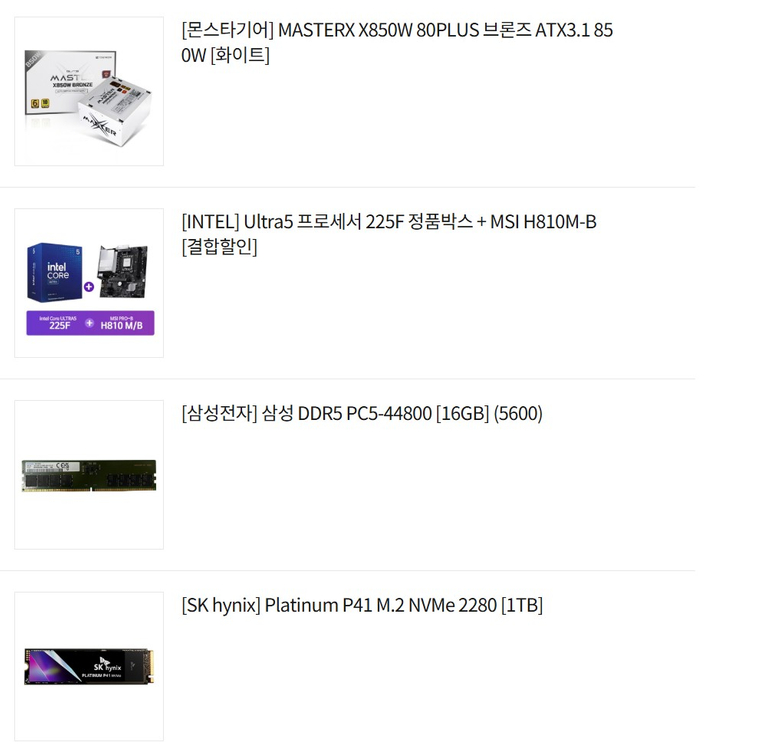 작년 10월 29일 컴퓨존 구매 후 조립 안한 새제품 일체 판매합니다. 아래 부품 품목입니다. 현 시세 램과 하드 가격으로 전체 다 파는 것이 pc 필요하신 분들은 좋은 기회일 것 같습니다. 갈산역 직거래 및 택배거래 빠르게 가능합니다. *부품 따로 판매는 안하고 일체로만 판매하니 개별 구매 문의는 자제 부탁 드립니다. [몬스타기어] 몬스타 가츠 Y300M 철가방 [화이트] [몬스타기어] MASTERX X850W 80PLUS 브론즈 ATX3.1 850W [화이트] [INTEL] Ultra5 프로세서 225F 정품박스 + MSI H810M-B [삼성전자] 삼성 DDR5 PC5-44800 [16GB] (5600) [SK hynix] Platinum P41 M.2 NVMe 2280 [1TB]