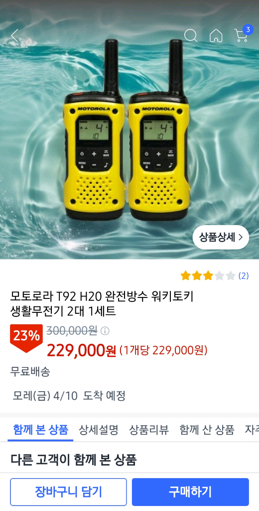 개인정보(거래정보)를 주고받는 행위는 사기에 노출될 수 있으므로 즉시 중고나라로 신고해 주세요모토로라 토크어바웃 T92 H20 무전기 2대 세트판매 휴대용이. 상태 양호 수신 잘 됩니다. 완전방수 본체 2개와 설명서, 충전 케이블이 포함 CU반값택배 가능