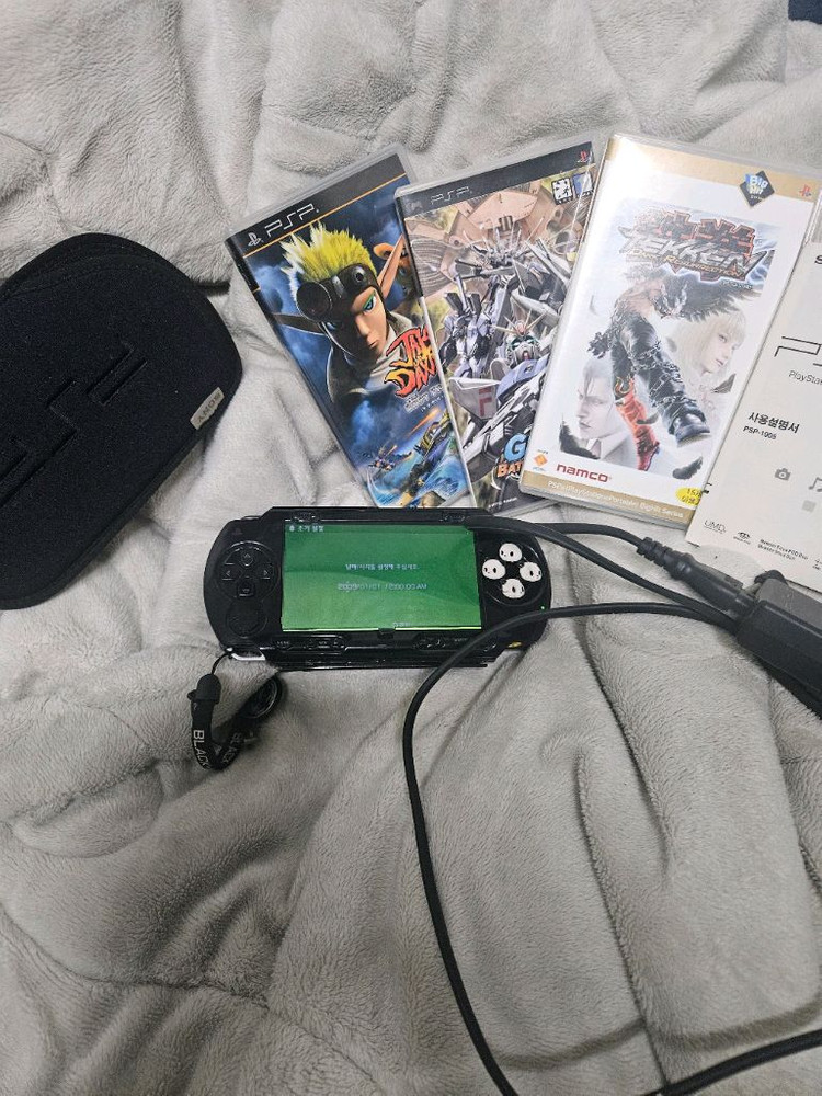 PSP 1005번들 세트 팝니다. 철권, 레이싱게임, 잭앤덱스터 게임 포함입니다. 충전기랑 케이스 같이 드려요! 문의 없으시면 바로 안전결제해주시면 됩니다! 설명서 1기가 메모리 스틱 보호 케이스 정품 충전기 밧데리 새거 한국 정발 (건담/레이싱 게임<철권케이스>/잭앤덱스터) 구성이며 정상작동 이상 없습니다.