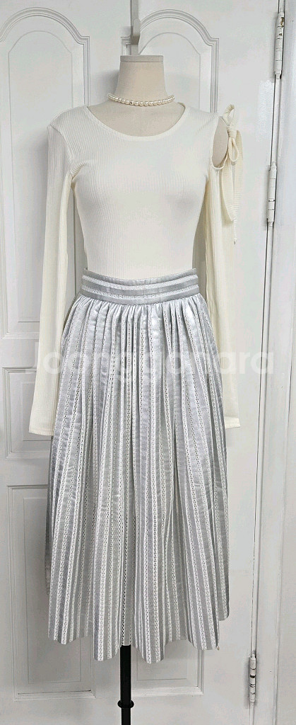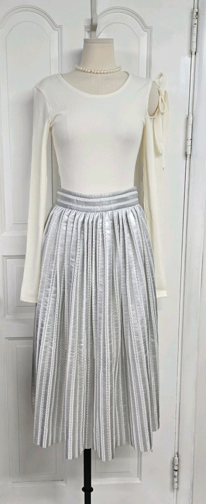 빛에 따라 은은하게 반짝이는 실버 톤 플리츠 스커트입니다. 과하게 튀는 느낌이 아니라 차분하게 고급스러운 광택이라 입었을 때 훨씬 분위기 살아나는 타입이에요. 촘촘하게 잡힌 플리츠 라인이 움직일 때 자연스럽게 퍼지면서 여리한 실루엣 만들어줍니다. ✦ 포인트 프랑스 브랜드 maje 은은한 실버 광택 (고급 느낌) 플리츠 디테일 → 움직일 때 핏 예쁨 허리 라인 깔끔하게 잡아주는 디자인 ✦ 핏 / 사이즈 사이즈: 2 상태:전체적으로 양호한 상태 가슴단면 : 어깨너비 : 총장 : 소매길이: 허리단면 :34 총장:78 ☆ 실측은 약간의 오차가 있을수 있으며,가지고 계신 제품과 실측 비교하여 구매하시는 것을 권장드리며,사이즈 조언은 어려우니 양해부탁드립니다!!(기준cm) 👌입금순!!! 🤩 우체국 택포!! 😎 교환/반품불가 !! 🧡❤️ 제 판매상품중 2개이상 구매하시는분 또는 재구매하시는분께는 에눌해드려요! 편안~~하게 문의 주시되 ,서로 기분 좋은 거래가 될 수 있도록 예의를 지켜주세요 :)