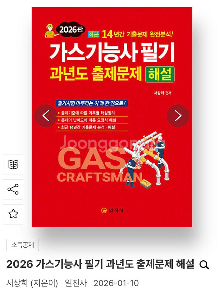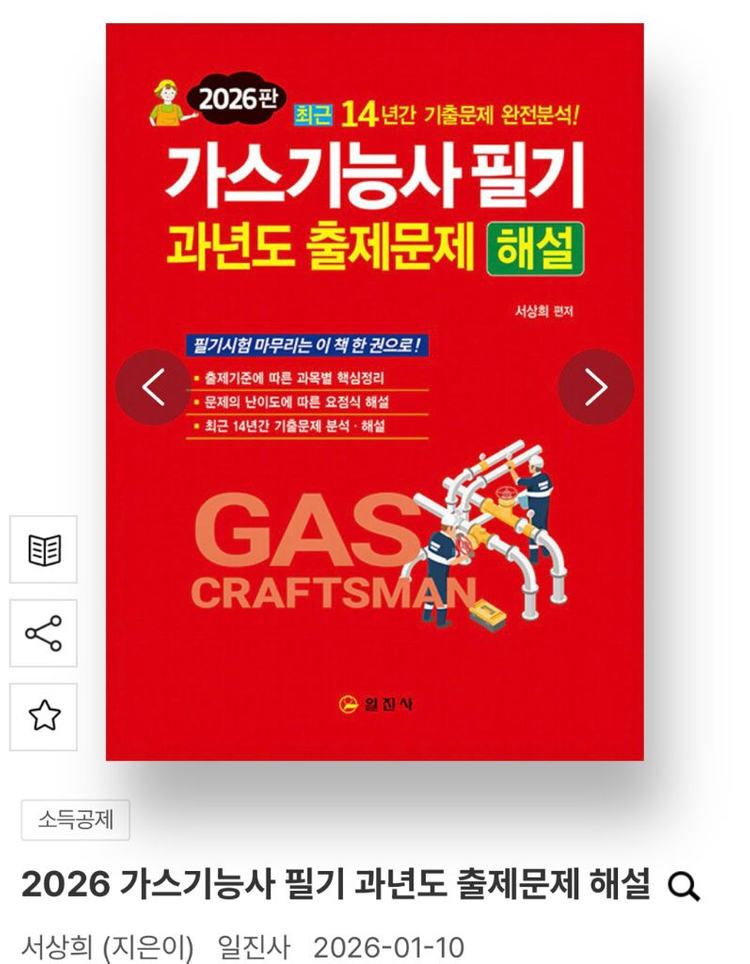 개인정보(거래정보)를 주고받는 행위는 사기에 노출될 수 있으므로 즉시 중고나라로 신고해 주세요2026년 가스기능사 필기시험 대비 과년도 출제문제 해설서예요. 새책 상태로 깨끗하고 실용적인 교재입니다. 분철해두었습니다