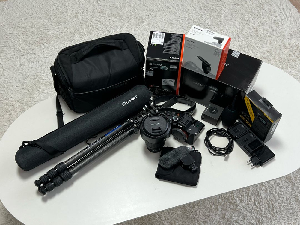 정가 합 : 7,242,800원 - A7M4 :3,090,000원 - 2470GM2 : 2,890,000원 - nikon arcrest ii protection filter : 170,000원 - ECM-B1M : 429,000원 - SF-M256 : 189,000원 - NP-FZ100 : 85,000원 - LCS-SL20 : 49,000원 - LY-224C : 259,000원 - V-B02E : 34,800원 - USN4 PRO : 47,000원 셔터수 약 2만 중반 유튜브 및 릴스 그리고 고품질 사진 촬영에 적합한 장비들입니다. 시즌 별로 촬영을 해서 상태는 매우 좋습니다. 카메라 본체 아랫부분은 삼각대 체결 때문에 스크레치 생겼고 한 번도 떨어뜨린적 없습니다. 잠시 다른 일을 하게 되어 일괄 판매 합니다. 정가는 위와 같고 관심 있으면 연락주세요! 충전 어댑터와 선은 서비스로 같이 드려요~
