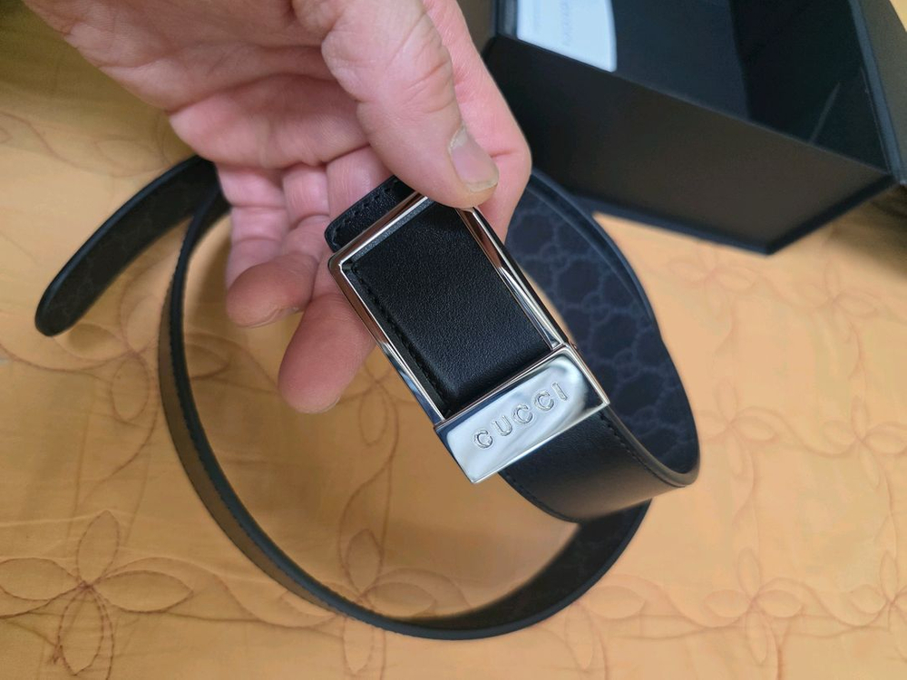 정품 남성 벨트로 새상품급 컨디션이에요. 박스와 더스트백 모두 포함되어 있고 상태 정말 좋습니다. 고급스러운 GG 패턴과 실버 버클이 포인트예요. 미착용 상품확인만했습니다 최신상 구찌 리버스 스퀘어 남성벨트구요 와이프가 해외갔다오면서 사왔네요~ㅠ 돈없어서 날립니다 사이즈가 32정도에 맞는사이즈입니다 앞뒤로 1인치정도는 이쁘게 착용하지싶습니다