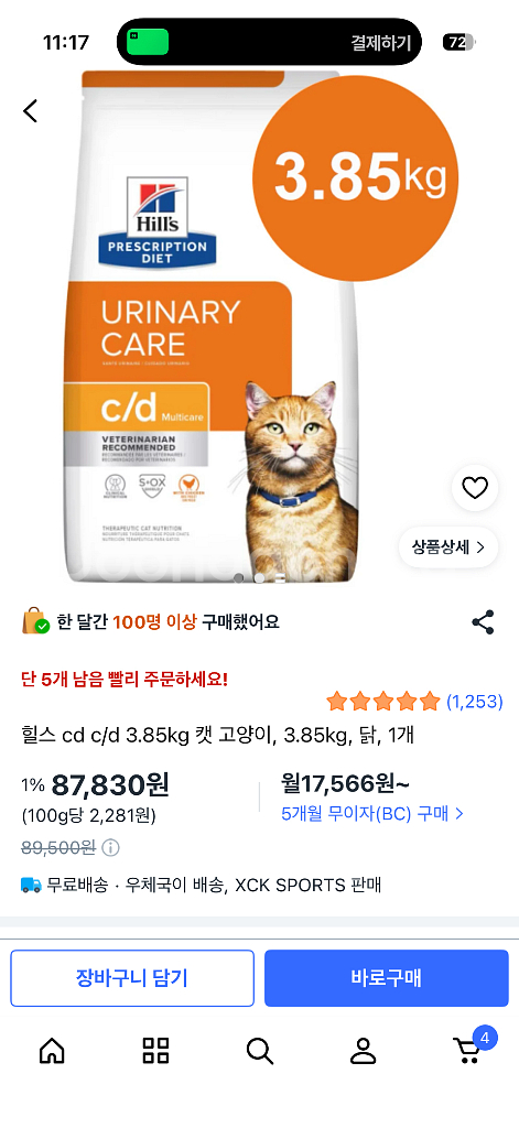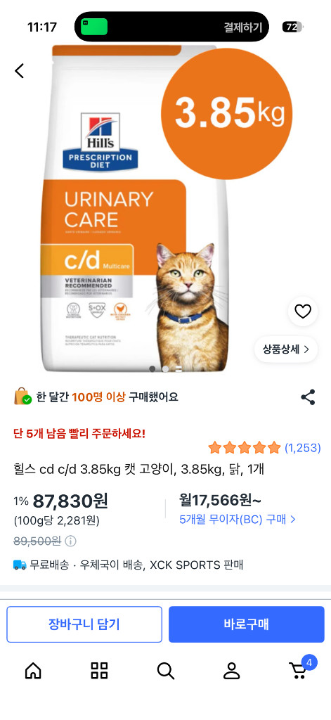 @ 2개 새상품 @ 유통기한 2026년 10월까지 힐스 Prescription Diet c/d Multicare Urinary Care 고양이 사료 3.85kg입니다 수의사 추천 제품으로, 요로계 건강 관리에 도움을 줄 수 있습니다 (방광염에 좋아요) (가격제안 안받습니다) (착불 택배 가능) - 제품명: 힐스 Prescription Diet c/d Multicare Urinary Care - 용량: 3.85kg - 대상: 고양이 - 특징: 요로계 건강 관리, 수의사 추천