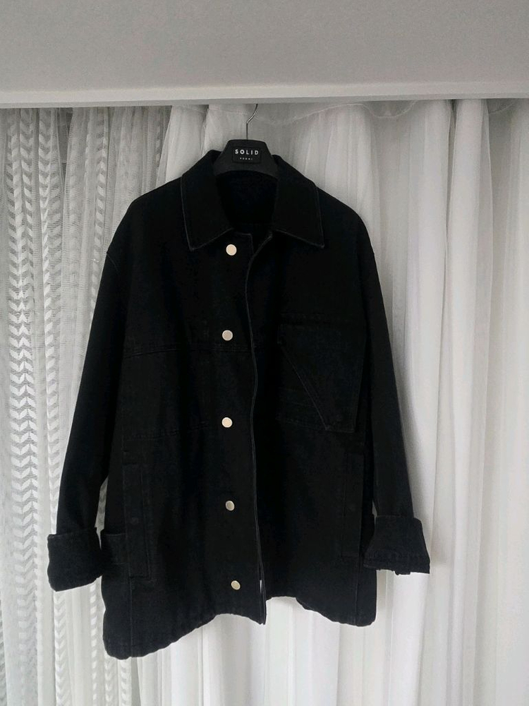 블랙 데님 셔츠 자켓이에요. 오버사이즈 핏으로 스타일리시하고 상태도 깔끔합니다. 가을겨울 데일리룩으로 완벽해요! 사이즈48 세미오버핏이라큽니다
