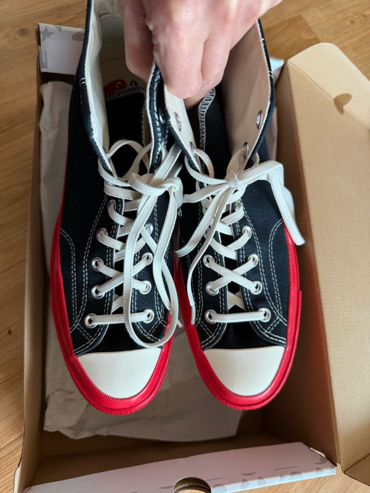 컨버스 꼼데가르송 플레이 콜라보 하이탑 블랙 색상에 빨간색 밑창과 하트 로고가 포인트!!! 박스 포함이고, 신발 사이즈는 295mm (US 11)예요 정가 150유로였어요. 꽉끈으로 신을 생각이리 1업 했습니다. 그리고 고무신발끈으로 교체해서 신고 벗기 편하게 해두었어요. 택제거 후 집에서만 시착했습니다 부피가 커서 택배보다 직거래를 선호 합니다.