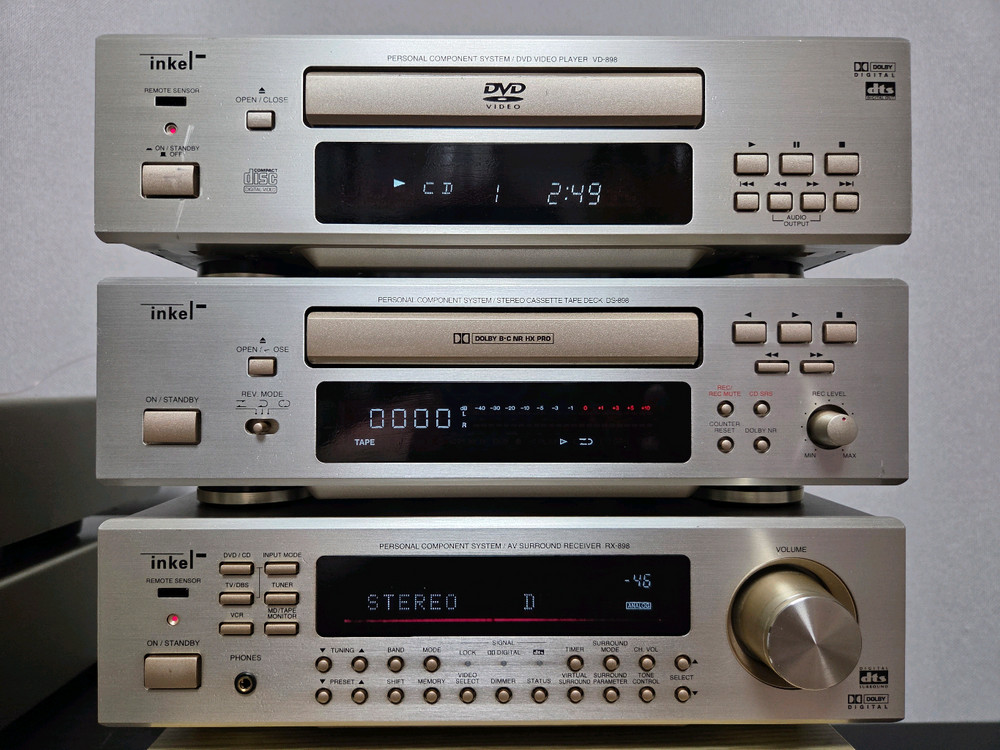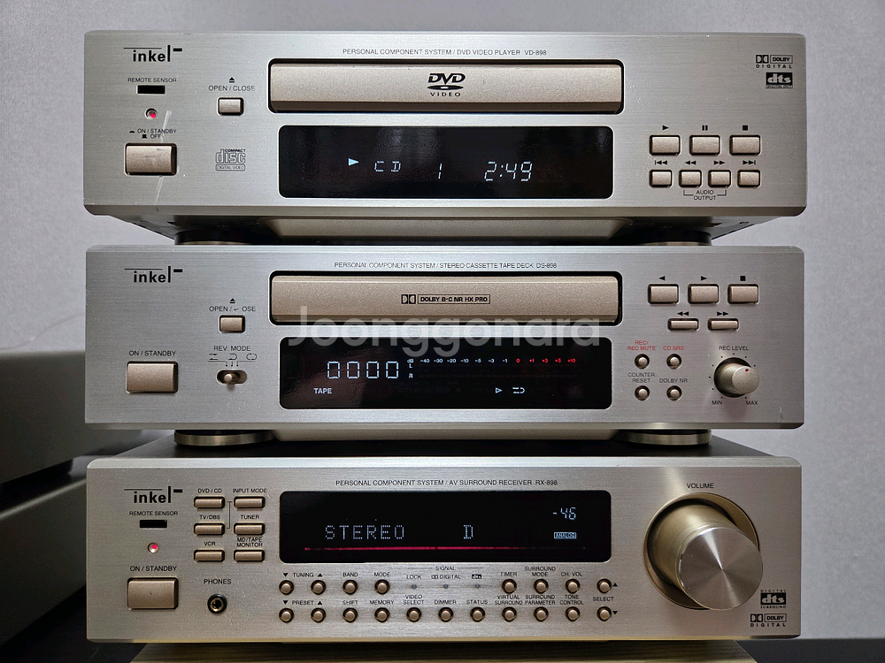 인켈 CD,DVD VD-898 인켈 데크 DS-898 인켈 리시버엠프 RX-898 전용리모컨 RM-P898 인켈서비스센타에서 수리,정검된 제품입니다. 시디 벨트 교체,픽업 세척 및 수리 정검 테크 벨트 교체 및 수리,정검 엠프 전면 버튼 올 교체 하였습니다. 튜너 교체 및 수리 정검,라디오 스테레오 수신 잘됨니다. 디자인 심플하고 인켈 미니 오디오 중 최강입니다. 외형 깨끗하고 상태좋습니다.