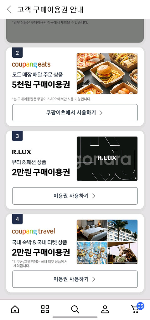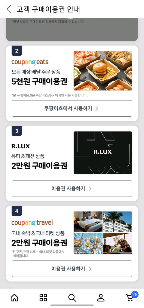 쿠팡 고객보상(트래블 4500, 럭셔리 5000) 3장씩 있어요~