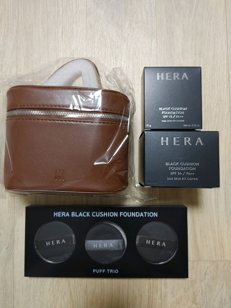 헤라 2025 블랙쿠션 홀리데이 세트예요. 색상은 21N1 이고 본품1개 리필2개 구성에 블랙쿠션퍼프 3개 추가 헤라 홀리데이 미니 메이크업 박스 구성이예요. 사용기한은 본품1개&리필1개 20280408일, 리필1개 20280924일까지예요.