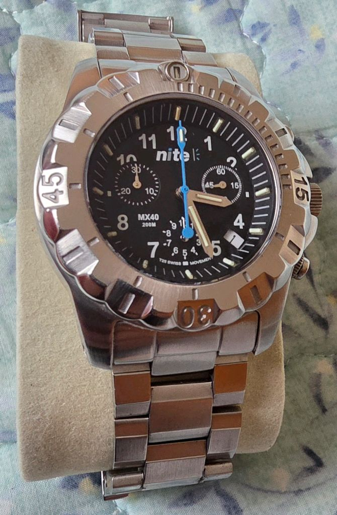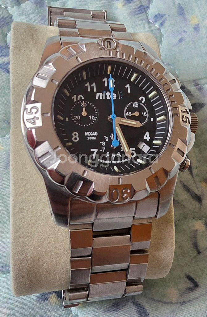 풀박스 A급 나이트 워치 Nite MX40-201 트리튬 / 스위스 쿼츠 / 희귀 모델 "영국 밀리터리 감성의 정점, 나이트워치(Nite) MX40-201 풀구성 매물입니다." 영국 본사에서 직접 공수해야 했던 희귀 모델로, 현재 국내 중고 시장에서 이 정도 컨디션의 풀박스는 찾기 힘드실 겁니다. 저가형 패션 시계와는 체급부터 다른 진정한 **'툴워치(Tool Watch)'**입니다. 스위스 Ronda 쿼츠: 신뢰의 스위스 무브먼트로 오차 없이 정확합니다. 사파이어 크리스탈: 기스 걱정 없는 강력한 강도 (무반사 코팅 적용) 200m 방수: 아웃도어, 캠핑, 다이빙 등 거친 환경에서도 완벽 작동. 🔥 자가발광 트리튬(Tritium): 외부 빛 충전 없이 24시간 스스로 빛납니다. 야간 가독성 끝판왕입니다. 상태: 글라스 기스 전혀 없으며, 베젤과 메탈 밴드에만 자연스러운 생활 기스 있는 A급 컨디션입니다. 구성: 시계 본체 + 여분 링크 + 정품 박스 + 보증서/설명서 (풀구성) 메탈 밴드 여분 링크까지 다 있어 손목 굵기 상관없이 착용 가능합니다. 사진 그대로이며, 궁금하신 부분 채팅 주시면 추가 사진 보내드립니다. 쿨거래 우선하며, 이유 있는 네고는 기분 좋게 고민해 보겠습니다. 찔러보기는 정중히 사양합니다. 국내 중고 시장에서도 매물 자체가 거의 없는 모델로, 찾는 분들만 아시는 시계입니다. 나이트워치 모델은 국내에서 구하기 힘든 디자인이라 소장 가치 충분합니다. 집에 모셔두기만 하던 시계들 처분 목적으로 저렴하게 올립니다. #나이트워치 #밀리터리시계 #트리튬시계 #NiteWatches #MX40 #남성시계 #희귀매물