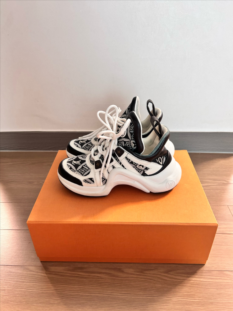 루이비통 아치라이트 스니커즈 판매합니다. 구매 시기: 2020년 9월 사이즈: 36사이즈(230) 구매 장소: 신세계백화점 강남점 (정가 148만 원) 상태: 실착 5회 미만, 전체적으로 'S급'에 가까운 컨디션 특이사항: 시즌 한정 모델로 디자인이 정말 예쁘게 나온 제품입니다. 구매 당시 제 사이즈가 품절이라 무리해서 큰 사이즈를 구매했는데, 아무래도 사이즈가 크다 보니 손이 잘 가지 않아 몇 번 못 신고 보관만 해왔습니다. 약간의 미세한 이염 외에는 사진에서 보시는 것처럼 아주 깨끗합니다. 사이즈 문제로 눈물을 머금고 저렴하게 내놓으니, 맞는 분께서 좋은 가격에 가져가셨으면 좋겠네요.