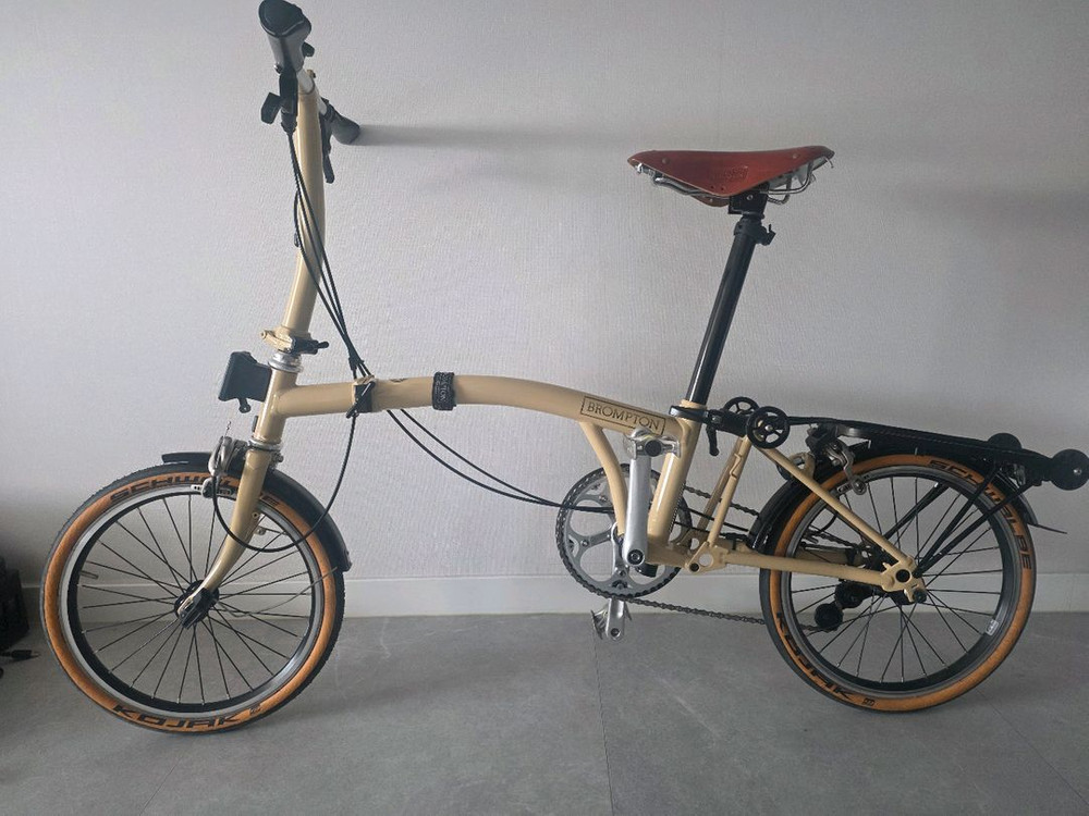 2024년 핫했던 샌드 색상으로 도색한 정품 브롬톤 입니다. 원래 블랙색상이였는데 샌드색상이 너무 맘에들어서 기추 하지않고 전문 도색업체에 맡겨서 제가 타던 브롬톤을 도색했습니다. 기본 바디는 2016년식 이지만 부품을 최신 블랙파츠도 함께 바꾸고 DTswiss 3단 레버에 기존 스프라켓도외장 2단에서 외장3단으로 바꿔서 약오르막도 잘 올라갑니다. 타이어도 작년가을에 구매후 100키로 정도 밖에 안탔습니다 패달도 MKS 탈착형이라 아주 편해요 사진에서 보이는 그대로 외관은 약간의 사용감 제외하면 깔끔한 상태를 유지하고 있습니다.