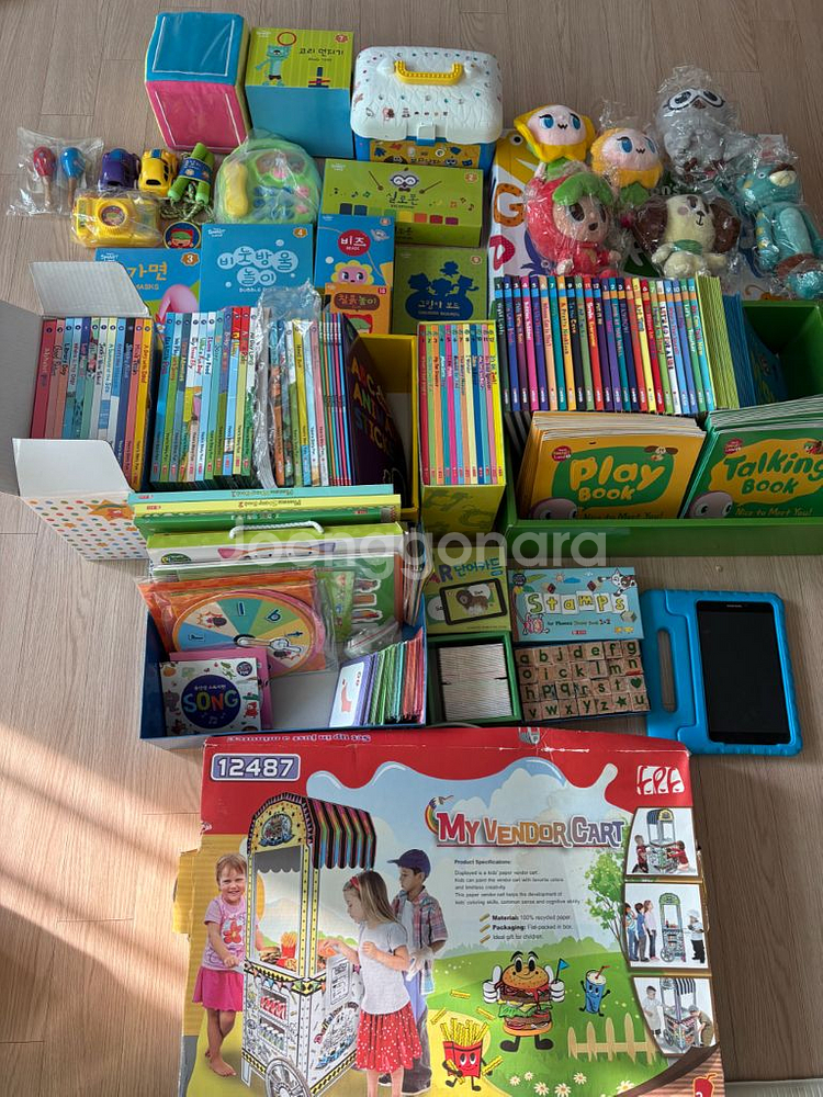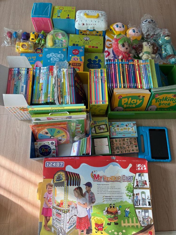 영어 초입에 너무 좋은 윤선생 스마트랜드 1,2, 파니퍽스펀, 스토리펀 탭 및 도서 및 교구 세트에요. 저희 아이 5세 말부터 시작해서, 초1 중반까지 기초 잘 잡고 이제 끝나고 학원으로 가면서 내놓습니다. 파닉스 잘 잡혔고 무엇보다 영어를 재밌게 배워서 너무 좋알했어요. 스마트랜드 교육용 책들과 인형, 장난감 등이 포함된 대용량 세트예요. 아이들 학습과 놀이에 좋은 구성으로 되어있어요. 아이가 사용하다보니 사용흔적 있는 책도 있고, 아예 본 흔적없는 책들도 있어요. 교구는 사용해서 사용감 있는 것도 있고, 없는게 있을수도 있어서 저렴하게 내놓습니다. 합쳐서 몇백 들여서 구매했던 것 같아요. 유아 영어 시작한다면, 적극 추천 합니다. 탭도 C핀 청전기라 편하게 사용하실거에요. 직거래는 경기 광명이며, 택배도 두 박스 나눠서 보내면 가능 할 것 같아요. 문의 많이주세요.