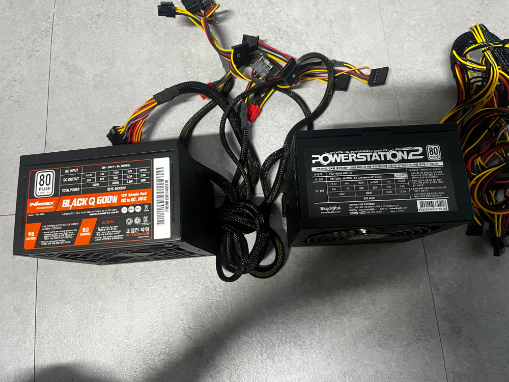 컴퓨터 파워 400W, 600W 판매 합니다. BLACK Q600W, POWERSTATION2 450W 입니다. 오래된 제품이고 실 사용 시간도 5~6년 정도 됩니다. 스패어나 기타 사용 목적 있으신 분께 구매 추천 합니다. 일괄 구매 시 8000원 개별 구매 시 각각 5000원 입니다.