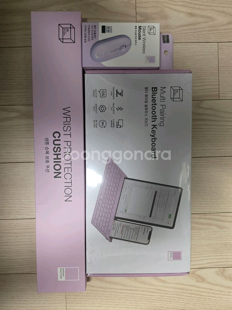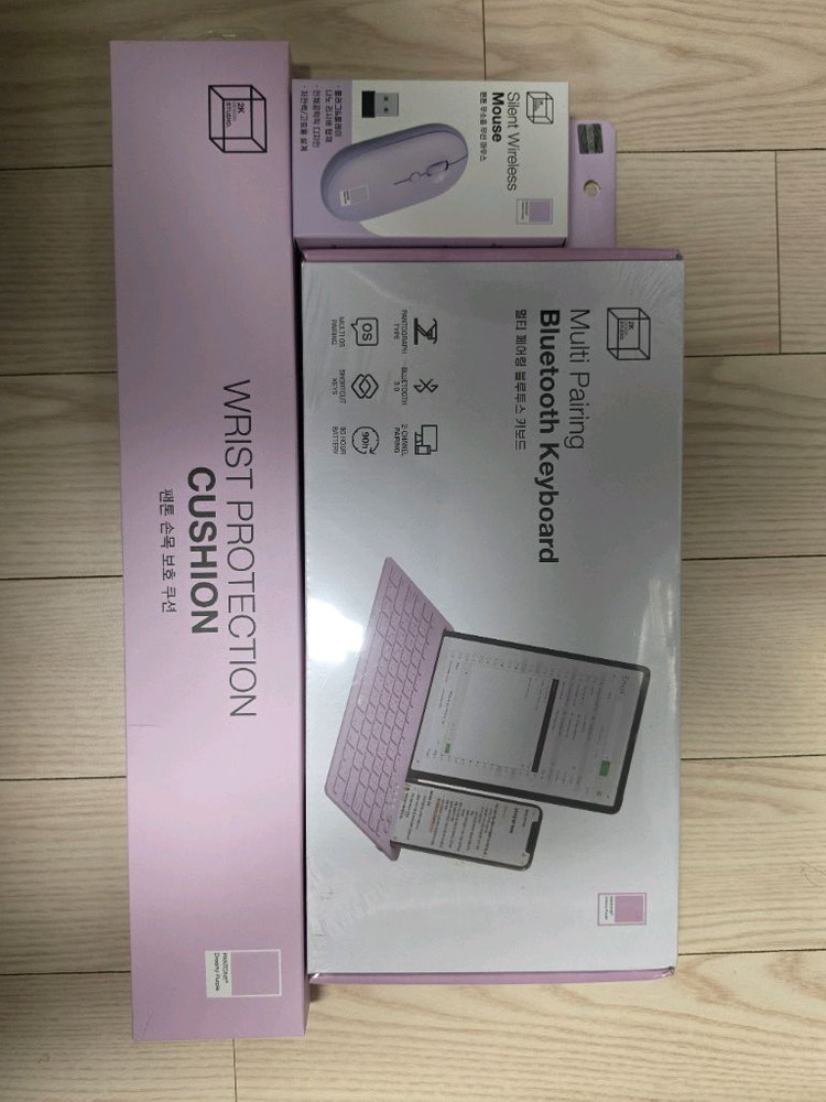 팬톤 멀티 페어링 블루투스 키보드. 마우스. 손목 쿠션 3종 풀세트이며. 미개봉 새제품입니다. 키보드와 손목쿠션. 마우스 3종 최저가 45,630원입니다. 배송비는 착불이며 5000원 내외입니다.
