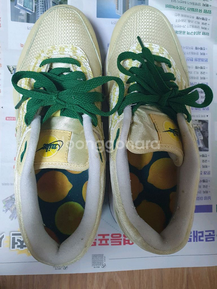 매력적인 레몬 패턴이 돋보이는 나이키 에어맥스 1이에요 깔끔한 옐로우 컬러에 봄에 어울리는 디자인입니다 1회 시착하고 에어맥스 취향이 아니라 보관만 했었습니다 사진처럼 마모나 사용감 거의 없습니다 편의점 택배 가능하며 직거래는 여의도에서 가능합니다