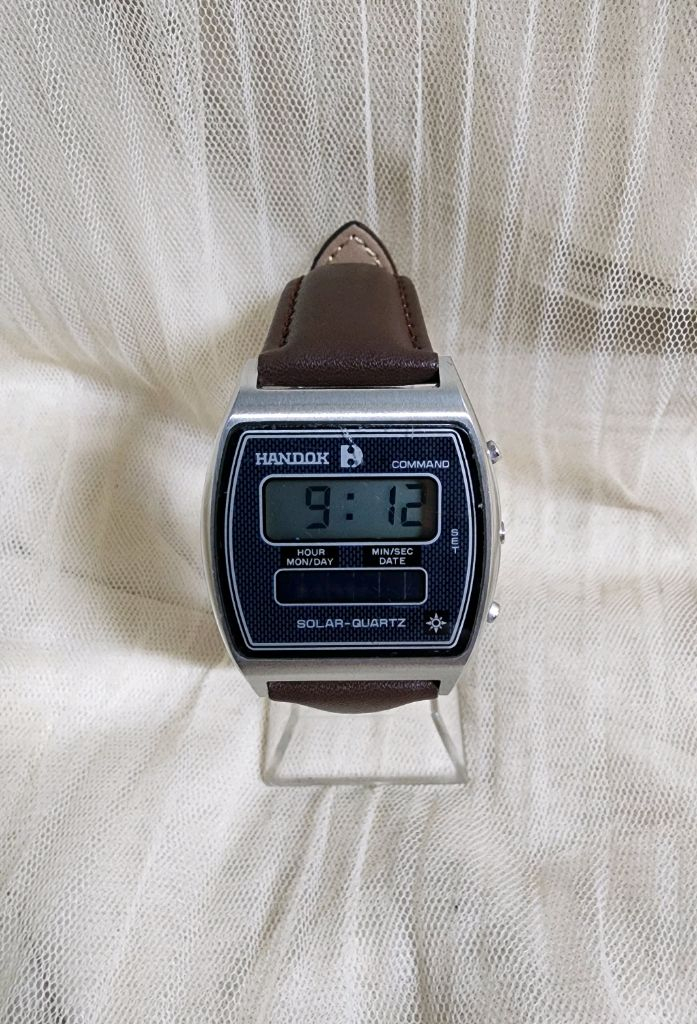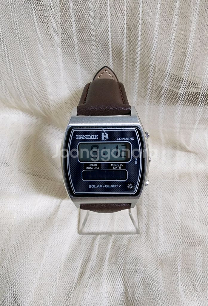 전설적인 '돌핀(Dolphin)' 시계를 제조했던 한독의 빈티지 제품 으로 'SOLAR-QUARTZ' 라는 명칭에서 알 수 있듯이, 기본 배터리 외에 태양광 패널을 통해 에너지를 보충하는 솔라 충전 방식의 쿼츠 무브먼트를 탑재하고 있습니다. 하단에 가로로 긴 형태의 태양광 패널이 배치되어 있으며, 상단 LCD 창에는 시간(Hour), 분/초(Min/Sec), 월/일(Mon/Day), 날짜(Date)가 표시되는 전형적인 80년대 레트로 스타일입니다. 당시의 기술력이 집약된 시계로 희소성 있는 아이템입니다. ●배터리 교체완료 ●밴드 교체 ●유리 미세기스 ●사이즈ㅡㅡㅡ약 34mm 구매를 원하시면 안심결제를 이용하여 언제라도 결제하시면 됩니다.