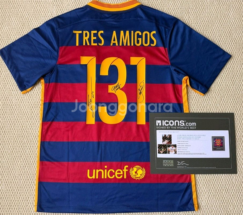 MSN 사인이 들어간 유니폼입니다. 인증은 아이콘즈 인증입니다. 131은 골 넣은수 그리고 tres amigos는MSN을 뜻합니다 찔러보기 차단합니다. 계좌거래, 안전결제 다 가능한데 계좌로 하시면 수수료 제외하고 구매가능 구매문의 외 답장 안하겠습니다 택배비 착불 마지막 사진 2장 확인해주세요 바로 결제하셔도 됩니다