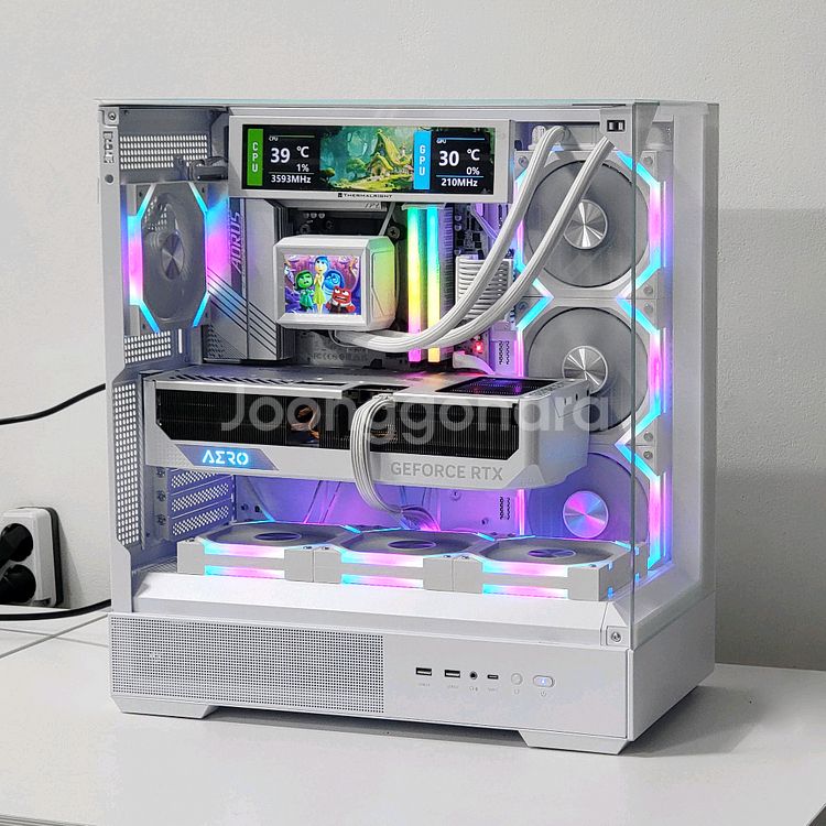 CPU : 라이젠 7800X3D 국산정품 CPU쿨러 : 맥스틸 MAX3100 ARGB LCD 수냉쿨러 화이트 메인보드 : 기가바이트 B650M 어로스 엘리트 AX ICE 램 : JUHOR DDR5 5600MHz 32GB(16 X 2) SSD : WD SN350 M.2 NVME 1TB 그래픽카드 : GIGABYTE RTX 4080 SUPER AERO 파워 : 몬스타 가츠 MASTERX X850W ATX3.1 화이트 케이스 : 잘만 P40프리즘 화이트 보조모니터 : Thermalright Trofeo Vision LCD 화이트 9.16인치 맥스엘리트 슬리빙케이블 추가 대부분의 부품들은 신품으로 조립하여 부품들 새컴퓨터급의 컨디션입니다. 거의 유일한 중고부품인 그래픽 카드는 27년 9월까지로 보증기간 넉넉히 남아있습니다. 싸구려나 허접한 부품 없는 7800X3D 4080SUPER 조합으로 FHD, QHD는 물론이고 4K까지도 준수한 성능을 뽑아줍니다. 이미지와 동영상이 커스터마이징 가능한 3열 수냉쿨러에 메인보드 연동으로 원하는 색상으로LED제어가 가능합니다. 파손위험과 기타 이유들로 웬만하면 직거래를 선호합니다. 택배 및 번개페이도 가능하긴하나, 여러 고려사항들이 있습니다. 직거래가 어려우신 경우는, 바로 결제하지 마시고, 먼저 채팅주시면 감사하겠습니다. 똑같거나 비슷한 디자인으로 원하시는 사양으로 조립의뢰도 가능합니다.