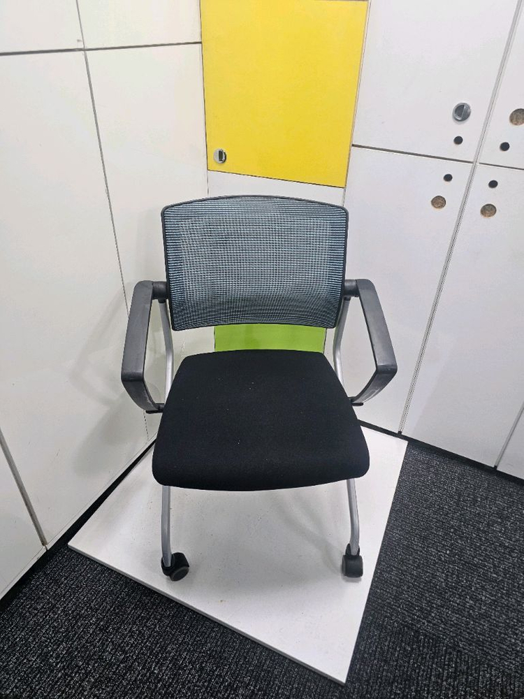 깔끔한 디자인의 블랙 메쉬 팔걸이 회의용 의자예요 등받이와 좌석 모두 편안한 착좌감을 제공해요 바퀴가 달려 있어 이동이 편리하답니다 사무실이나 회의실에 두기 좋은 의자예요 폴딩의자 중고 개당가격입니다 바퀴이동식 보유량 30개정도 상태깨끗하네요