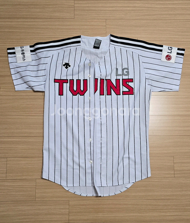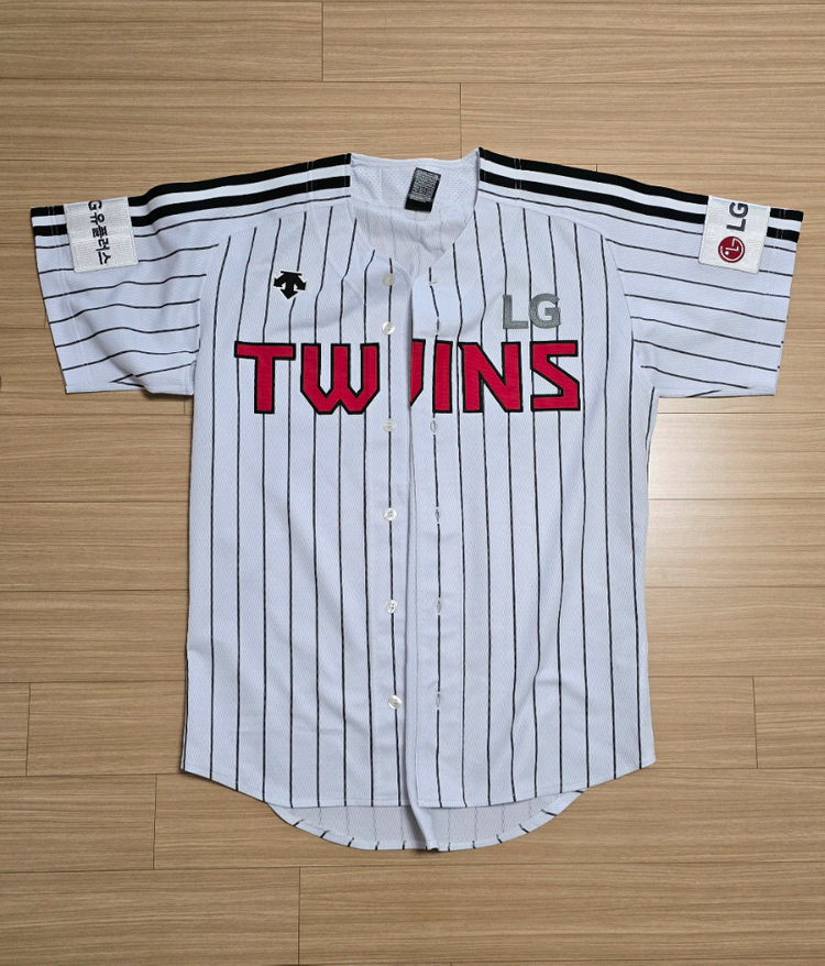 프로야구팀 정품 스트라이프 유니폼이에요. 화이트 바탕에 블랙 스트라이프 패턴과 레드 팀 로고가 포인트입니다. 선수용 데상트 노마킹 유니폼 입니다 입어본 적은 없고 소장용으로 보관중이였습니다 상태는 거의 새상품이라고 보시면 되겠습니다 ^^