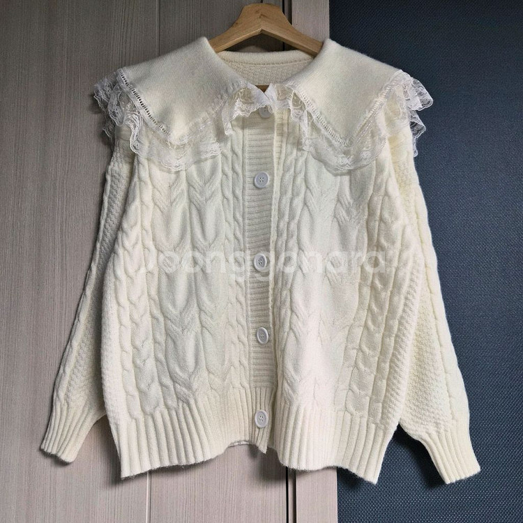 레이스 빅카라가 포인트인 화이트 케이블 니트 가디건입니다. 구매 후 미착용 새상품입니다. 카라에 레이스가 들어가 있어 러블리한 빈티지 감성이고 케이블 니트라 포인트 코디하기 좋은 디자인입니다. 카라가 크게 들어가 있어서 얼굴이 작아 보이고 단추 잠가 니트처럼 입어도 예쁘고 가디건처럼 걸쳐 입어도 예쁜 디자인이에요. 청바지, 스커트, 원피스랑 코디 잘 어울리고 요즘 빅카라 / 레트로 빈티지 니트 스타일 유행이라 포인트 주기 좋은 가디건입니다. 봄 코디용으로 입기 좋아요. 상태 미착용 새상품 보관 상태 좋습니다 편하게 채팅 주세요 :)
