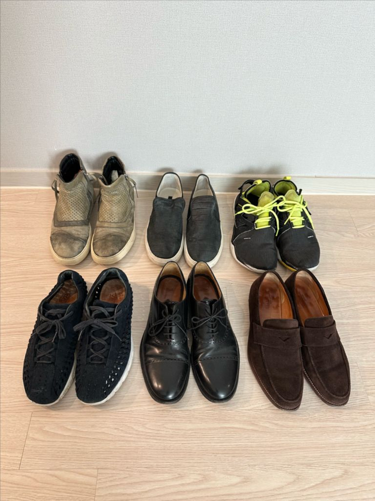 상단 좌측부터 순서대로 1. 이태리 제조 카키 하이탑 스니커즈(eu42. 오른쪽 안쪽 고무부분 약간 벌어지나 거의 티는 안남): 20만원대 구매 -> 1만원 2. Tiger of Sweden 블랙 슬립온 (eu42): 20만원대 구매 -> 2만원 3. 리복 나노웹 운동화 (usa 11, 290mm): 2만원 4. 나이키 메이플라이 단화 (285mm): 10만원대 구매 -> 3만원 5. 폴스미스 블랙 옥스포드 슈즈(UK 8.5): 27만원 6. 마시모두띠 브라운 스웨이드 로퍼(43/KR275라고 표기되어있으나 약간 크게나와서 280mm 추천): 20만원대 구매 -> 8만원 모두 정품. 정리중이라 왕창 싸게 올려요.
