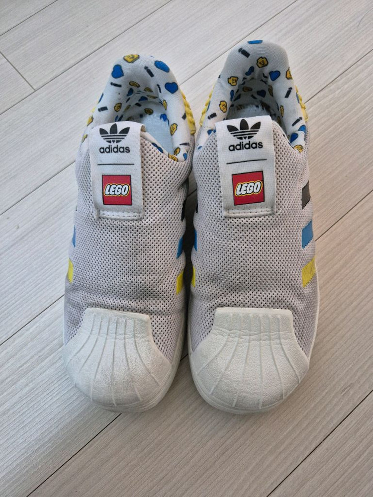 아디다스 슈퍼스타 360 레고 콜라보 운동화 레고 블록 디자인이 귀엽게 들어간 제품입니다 안쪽 패턴과 힐컵 부분에 레고 브릭 모양이 포인트로 들어가 있어요 아이들이 신기 편한 슬립온 디자인으로 활동량이 많은 아이들에게 딱이에요 2개월정도신었ㅇㅓ요 제가세탁은했는데 빨래방맡김더깨끗할거예요 폴로운동화ㅡ 앞에구겨져금간가있지만 임시로신기기좋음 원하시믄서비스