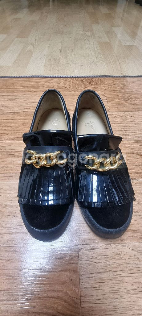 쥬세페 자노티 골드 체인 프린지 로퍼 (41.5 / 265~270) [상세 설명] 1. 제품 정보 브랜드: 쥬세페 자노티 (Giuseppe Zanotti) 17SS 프린지 골드 청키 체인 슬립온 로퍼 사이즈: IT 41.5 (국내 사이즈 265~270mm 추천) 270발볼이 좀 작으면 가능할듯 합니냐 색상: 블랙 & 골드 체인 쥬세페 자노티의 시그니처인 굵은 골드 체인이 포인트인 화려한 로퍼입니다. 발등 부분의 프린터 디테일과 유광 이태리 메이드 제품으로 탄탄하며, 슬립온 스타일이라 신고 벗기 편합니다. 자연스러운 사용감 외에 하자는 7번짜 사진에 보면 오른쪽부분 실밥이 하나 터져서 이부분이 하자라면 하자입니다 이 부분은 수선하셔도 되고 그냥 신으셔도 크게 문제될부분은 아닌거 같으니 참고하세요 사진 보시는 것처럼 바닥 각인 선명하고 체인 도금 상태 양호합니다. 발볼이 좁게 나온 편이니 참고하세요 선물받은건데 몇번신고 신발장에 보관하던 제품이라 불용품이라 팝니다 필요한분 톡주세요 가급적 직거래 원해요 지역은 경기광명입니다