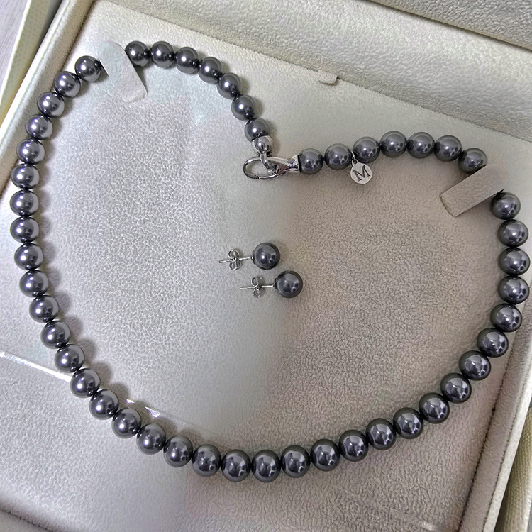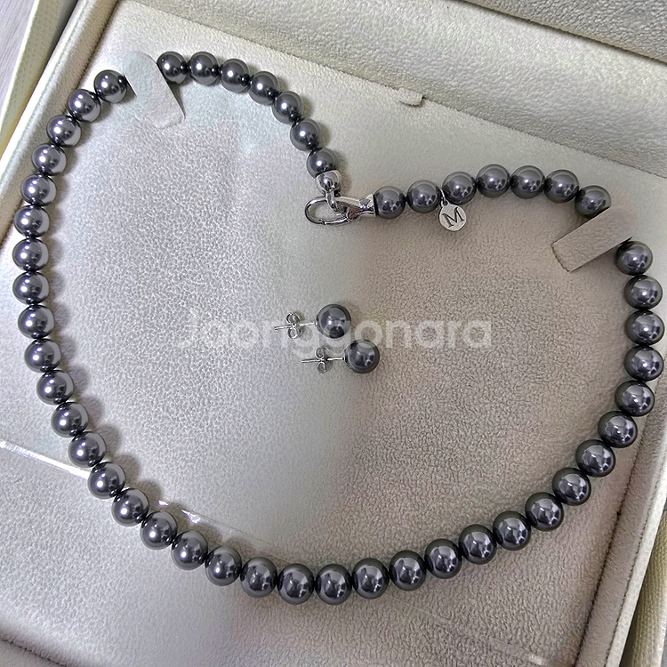샤넬에서도 사용하는 스와로브스키 오스트리아산 정품 흑진주 8mm로 만들어진 흑진주 목걸이와 귀걸이 세트에요. 8mm 진주는 예물로도 가장 많이 하는 기본 사이즈로 고급스러운 단아함을 자랑해요. 색이 너무 곱고 광채가 진짜 영롱해서 얼굴이 화사해보이고 너무 우아해져요 특히 원피스나 캐쥬얼에 착용하면 굉장히 어려보이고 다른 목걸이와 레이어드하여 여러개 같이 차시면 더 트렌디해보여요. 잠금장식도 푸싱버튼으로 눌러서 고리에 끼우고 놓으면 자동으로 잠겨서 아주 편해요 18K 골드 도금된거라 변색방지 및 알러지방지가 되며 스페셜참이 달려 있어 더욱더 차별화되는 고급스러움이 있어요. 착용하실때 잠금장식과 스페셜참을 옆으로 쇄골쪽에 보이도록 착용하시면 (잠금장식이 위, 스페셜참이 아래 방향으로) 화이트골드 빛이 반짝반짝해서 더 고급스럽고 예뻐요 일반 진주목걸이와 차별화되서 더 비싸보여요. 진주도 장식도 모두 최고급 소재에요. 저렴하게 내놓으니 언능 가져가셔서 예쁘게 착용하세요. 새상품이라 선물하셔도 됩니다. 구성품: 스와로브스키 정품 흑진주 목걸이&귀걸이 세트 진주크기: 8mm(가장 많이 하는 기본 사이즈) 목걸이 총길이: 약 44cm (잠금장식 포함) 진주컬러: 흑진주(다크그레이) 목걸이만 구매시에도 가격은 동일합니다.
