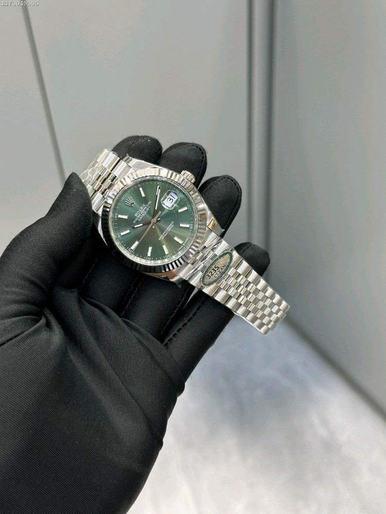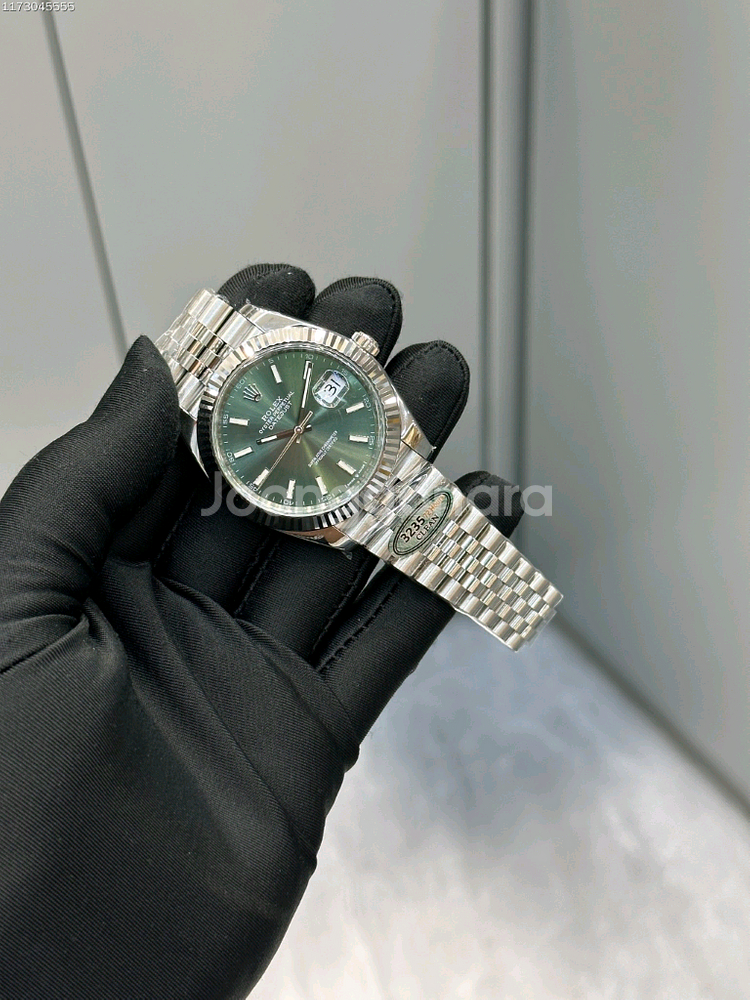 롤렉스 데이트저스트 / Rolex Datejust 시계입니다. 상품명: 롤렉스 데이트저스트 36 "모시 그린" 스틸 / Rolex Datejust 36 "Motif Green" Steel 제품 특징: - 브랜드: 롤렉스 / Rolex - 모델: 데이트저스트 36 퍼페추얼 데이트 / Datejust 36 Perpetual Date - 케이스 재질: 스테인레스 스틸 / Stainless Steel - 케이스 사이즈: 36mm - 다이얼: 모시 그린(Motif Green) 선 다이얼 / Motif Green sunburst dial - 베젤: 화이트 골드 플루테드 베젤 / White gold fluted bezel - 시침: 화이트 마킹 및 야광 / White marking and luminous hands - 시간 표시: 화이트 바 마커 / White bar markers - 캘린더: 날짜 창(Date window) / Date window at 3 o'clock - 브레이슬릿: 스테인레스 스틸 줄리우스 브레이슬릿 / Stainless steel Jubilee bracelet - 무브먼트: 롤렉스 캘리버 3235 자동 무브먼트 / Rolex Caliber 3235 automatic movement - 방수: 100m 방수 / 100m water resistant - 특별 디테일: 화이트 골드 베젤과 모시 그린 다이얼의 우아한 조합 / Elegant combination of white gold bezel and motif green dial 제품 설명: 이것은 롤렉스 데이트저스트 36 / Rolex Datejust 36으로, 롤렉스의 가장 클래식하고 상징적인 시계입니다. 모시 그린 다이얼은 부드럽고 세련된 색상으로, 햇빛에 따라 그라데이션이 변하는 아름다운 외관을 자랑합니다. 화이트 골드 플루테드 베젤과 줄리우스 브레이슬릿의 조합은 럭셔리하면서도 우아한 감각을 표현합니다. 1945년 출시 이래 가장 많이 팔린 롤렉스 모델로, 세계 어디서나 인정받는 가장 클래식한 럭셔리 시계입니다. 용도: 일상용 럭셔리 시계, 드레스 시계 / Daily luxury watch, dress watch