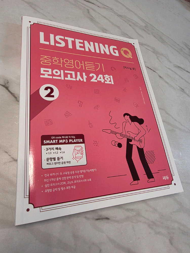 중학생 영어 듣기 실력 향상을 위한 Listening Q 모의고사 24회 교재예요 최신 5년 출제 경향 완벽 분석과 실전 모의고사 20회, 지난 모의고사 4회 수록되어 있어요 문항별 듣기, 빠른 편집 음원 제공해요 영어 듣기 실력 향상을 원하는 학생들에게 추천드려요 3~5장정도 풀이흔적 있어요