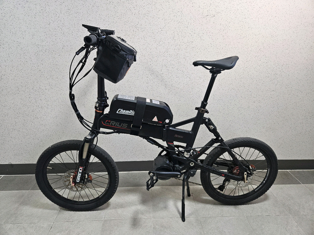 크리우스 올터레인 풀샥 폴딩 미니벨로입니다. 투세븐 DM01 52V 1000W 미드모터 장착 앞/뒤 에어 서스펜션에 가변싯포스트도 에어 서스펜션 기능이 있어서 승차감 아주 좋아요 주행거리 300km 미만, 지하주차장과 실내에만 보관해서 상태 좋습니다. XT 쉬프터라 고단으로도 2단까지 한번에 변속 가능하고, 변속 칼같이 잘 됩니다. PAS는 안되고 쓰로틀만 가능합니다. 52V 1000W 모터라 서울의 가파른 언덕도 다 올라갈 수 있습니다. 20인치 휠이지만 평지에서는 시속 40km 이상 금방 도달합니다. 52V 20Ah 배터리 (삼성 21700셀) (열쇠로 탈부착 가능) 시마노 XT 10단 변속기 시마노 XT 쉬프터 시마노 XT 브레이크 EXA 860i 가변싯포스트(서스펜션 기능) 파주 운정중앙역 근처, 또는 서울 신촌에서 직거래 가능합니다.