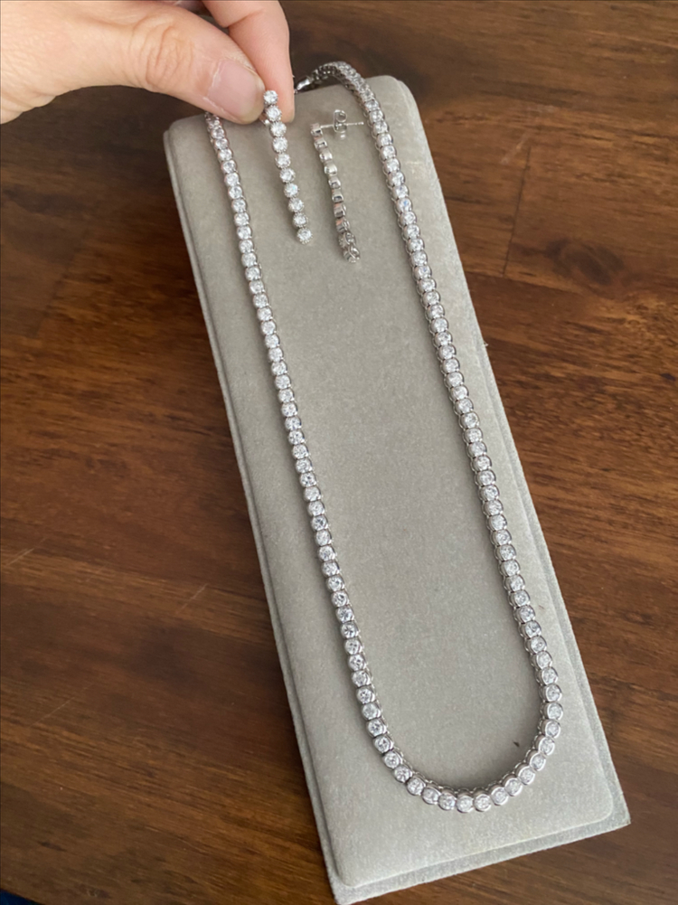 모던하고 깔끔한 디자인의 큐빅 테니스 목걸이와 귀걸이 세트 입니다. 악세서리 제품이지만 큐빅 한개한개 손으로 작업해서 발물림 기법으로 세팅되어 있고 마무리도 깔끔한 퀄리티 높은 아이템 입니다. 귀걸이 침부분은 925실버 소재로 되어있어서 알러지 예방해줍니다.(925각인) 사용감 전혀 없이 거의 새제품 같이 깨끗하고 좋은 상태 입니다. 실측사이즈 목걸이: 전체길이 44cm 폭 4.6mm 귀걸이: 전체길이 3.5cm 폭 3.8mm