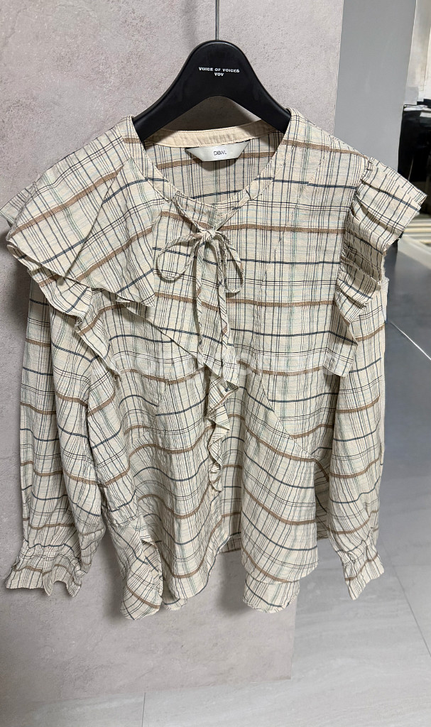 언발란스 러플이 포인트예요. 약간 에이라인 핏이라 입으면 더 예뻐요. 소매끝 러플처럼 되어있고 밴딩이 있어서 걷어올려도 예뻐요. 여름에도 달라붙지않는 소재라 시원하게 입을수 있어요. 세탁완료이고 상태 좋아요. 사이즈 66 가단 52 길이 56~62 답장이 늦을수 있습니다. 반품불가예요~