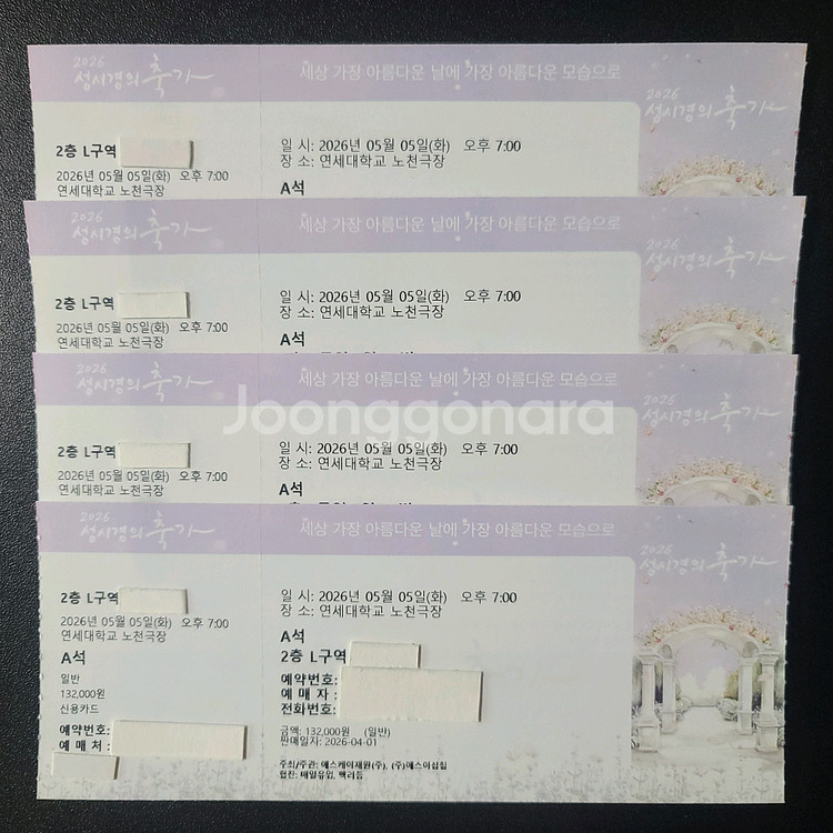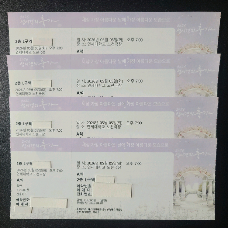 개인정보(거래정보)를 주고받는 행위는 사기에 노출될 수 있으므로 즉시 중고나라로 신고해 주세요2026 성시경 축가콘서트 연세대학교 노천극장 5월5일(화) A석 L구역 4~9열 2연석 통로석으로 자리위치 좋음 2연석으로만 판매 티켓배송되어 직거래나 등기 가능 전액 안전결제 가능(수수료 구매자 부담) 공연취소 이외 취소환불 불가