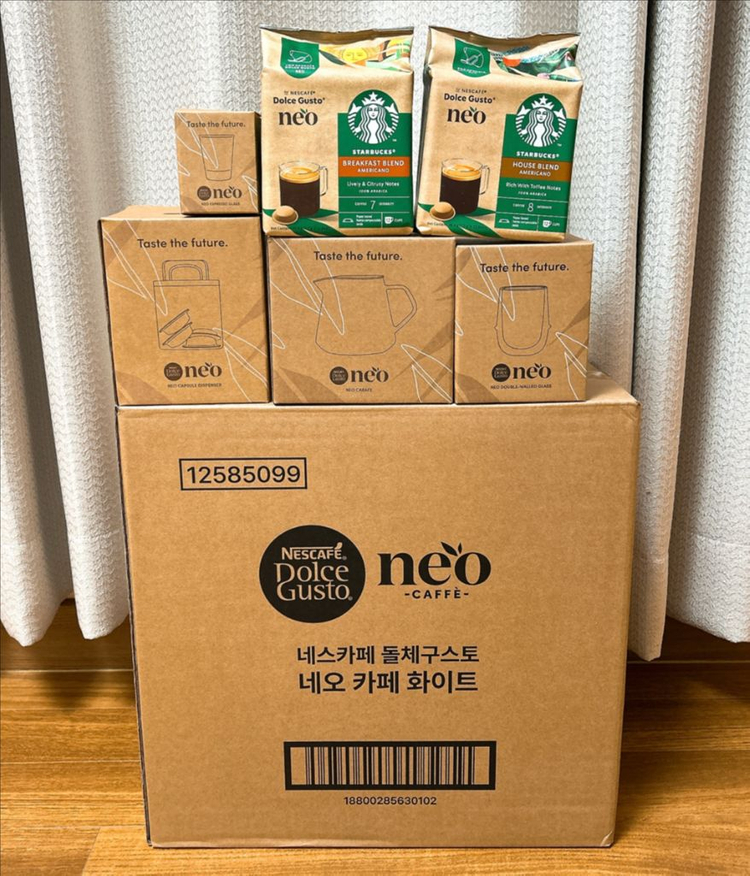 돌체구스토 네오 카페 캡슐 커피머신 색상 : 화이트 미개봉새제품 ⭐️네오 전용 캡슐 2종 증정 (스타벅스 하우스 블렌드, 블랙 블렌드 각 1개씩) ⭐️증정품 4종 (캡슐 디스펜서, 카라프, 더블월 글라스, 에스프레소 글라스) 정가 148,000원 판매가 택포 98,000원 에눌❌