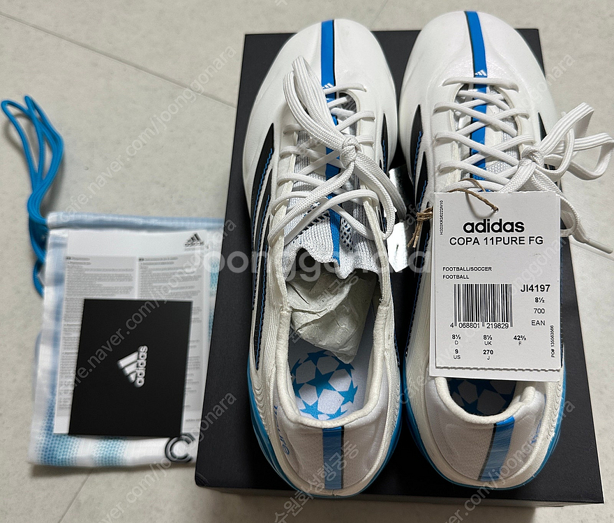 개인정보(거래정보)를 주고받는 행위는 사기에 노출될 수 있으므로 즉시 중고나라로 신고해 주세요코파11 퓨어 새상품입니다. (정가 299,000원) * 270사이즈 - 250,000원 (박스 라벨은 265로 표기되어 있음) * 275사이즈 - 260,000원