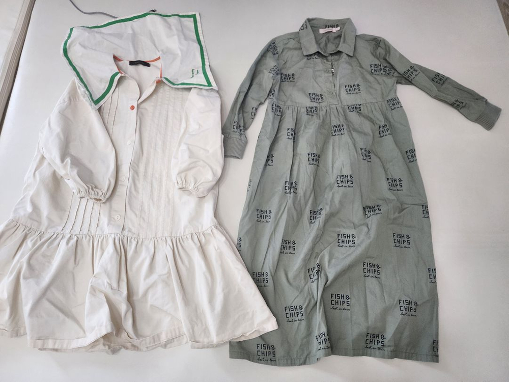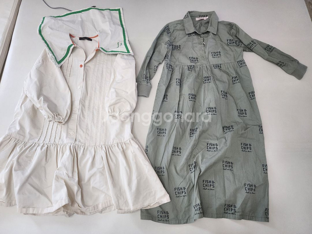 로아앤제인 흰색 세일러 스타일 원피스와 타이니코튼의 카키색 FISH & CHIPS 패턴 원피스입니다 - 봄.가을에 입기 좋은 스타일입니다 - 사이즈는 130사이즈,8T 입니다 - 흰색 치마부분 동그란 노란얼룩 발견 됐어요.색상때문에 사진엔 표현이 잘 안됩니다. 예민하신분은 지나쳐주세요. 전체적으로 원단 등 상태는 괜찮아요. 일괄택포
