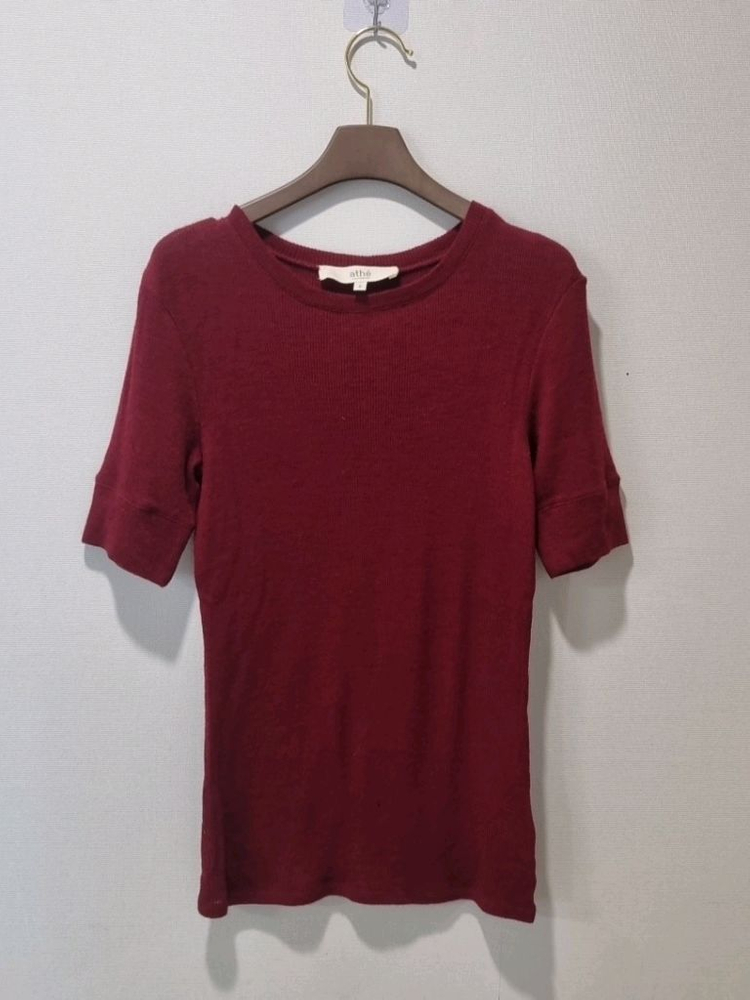 아떼 바네사브루노 니트 반팔티입니다. 고급스러운 단독이나 이너로 활용하기 좋은 제품이에요. 울 100% 소재로 부드럽고 따뜻하며, 신축성 좋아서 착용감 편안합니다. 심플한 디자인이라 데님, 슬랙스 어디에나 코디 잘 어울려요. S사이즈 (55 추천) 총장 61 신축성 있음 전체적으로 컨디션 양호합니다. 편하게입기좋아요