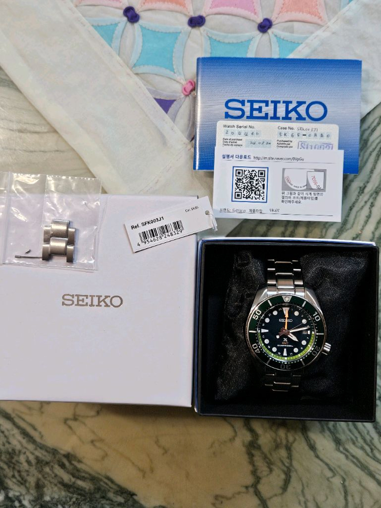 세이코 솔라쿼츠GMT SFK003J1로 국내 공식 매장 구입 풀박스 미착용품 브레이슬릿 조절후 실착용 전혀 없이 보관해 일체의 미세기스등 없습니다 일상 자연광에 충전되는 쿼츠로 최소 배터리 교환주기 10년 이상에 관리와 보수가 편리한 실용적 툴워치 입니다 200m방수, GMT기능, 탁월한 야광 톤 다운된 그린으로 다양한 착장에 멋스럽게 활용하기 좋은 제품 입니다 고양시 행신동 직거래 합니다 연락처 010 9264 5755