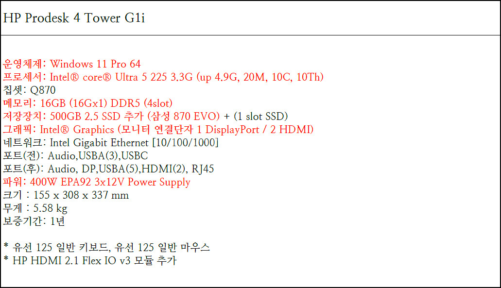 HP ProDesk 4 Tower G1i 데스크탑 새제품 2대판매합니다.(1대 90만원) 인텔 코어 울트라 5 프로세서와 DDR5 16GB 메모리, 500GB SSD를 탑재했어요 DP포트1개, HDMI포트2개, 400W 파워 서플라이를 갖추고 있습니다 OS 윈도우11프로 설치되어 있고 키보드,마우스 들어 있습니다 사무실에서 문서 작업 및 다양한 작업에 활용하기 좋은 제품입니다. 사무실에서 사용하려고 구매했던 제품이고 사용을 안하여 새제품 2대 판매합니다. 자세한 사양은 사진에 나와 있습니다. 1대당 90만원