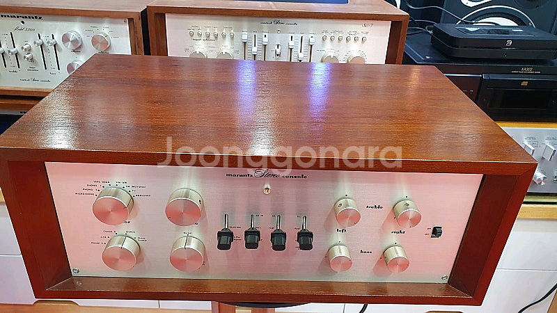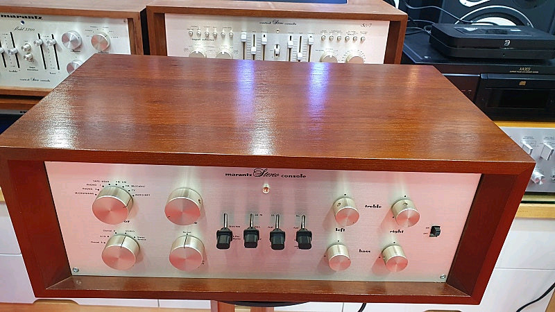 마란츠7K 진공관 프리앰프입니다. 초민트급/오리지날우드케이스이며 SERIAL번호 F040131 입니다. 마란츠 7K는 1979년 마란츠(Marantz) 7 프리앰프 출시 25주년을 기념하여 일본에서 발매된 키트(Kit) 버전 모델입니다 . 오리지널 모델인 7C의 회로를 기반으로 하며, 사용자가 직접 조립하거나 공장에서 완성품(Factory Version)으로 제작되기도 했습니다 . 1. 주요 제원 (Specification) 회로 방식: 3단 포노 이퀄라이저 회로 ("마란츠 회로") 사용 진공관: 총 6개의 12AX7 (ECC83) 사용 (채널당 3개) 7K 기본 키트에는 주로 GE 12AX7이 포함되었습니다 . 주파수 응답: 20Hz ~ 20kHz () 정격 출력: Pre-out 2V (최대 15V) 이득 (Gain): 포노 섹션 64.5dB / 라인 스테이지 22.5dB S/N비 (노이즈): -80dB (10mV 입력 시) 입력 단자: Phono 2개, Tuner 2개, Aux, Tape Head, TV 등 전원 전압: AC 100V (일본 내수용 기준) 크기 및 무게: 가로 391mm × 세로 155mm × 깊이 261mm / 약 5.0kg ~ 9.0kg (케이스포함 💰 고속버스,화물용달업체 배송시 (비용협의 8418 3387)