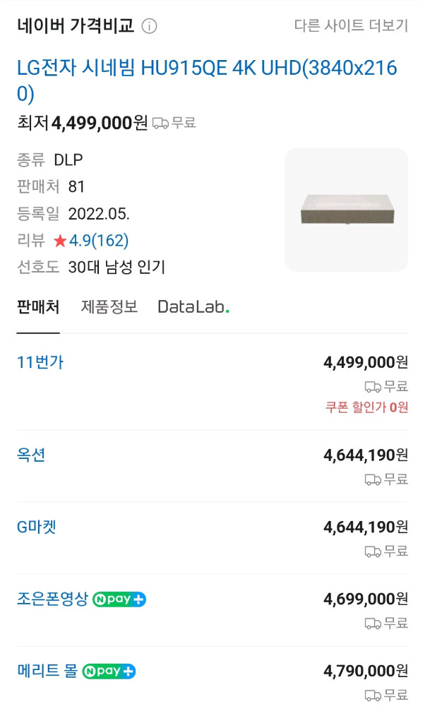 LG 시네빔 4K 초단초점 라인업 중 최상위 모델인 HU915QE 입니다. 거실이나 룸에 대화면을 구축하고 싶지만 투사 거리 확보나 천장 설치가 부담스러우셨던 분들께 가장 이상적인 기기입니다. 초단초점 모델중 최고급 기기입니다. lg답게 ott등 편의성도 최고구요. 벽 바로 앞 한 뼘 정도의 공간만 있어도 100~120인치의 압도적인 대화면을 만들어냅니다. 특히 완전한 암막 환경이 아닌 낮이나 조명이 켜진 환경에서도 쨍하고 선명한 화질을 즐기실 수 있습니다. 1000시간 이제 갓 넘겼습니다. 수명 2만시간이라 거의 새삥입니다. 상태 당연히 좋구요. 크기 때문에 직거래나 퀵, 용달정도 가능하지 싶습니다.