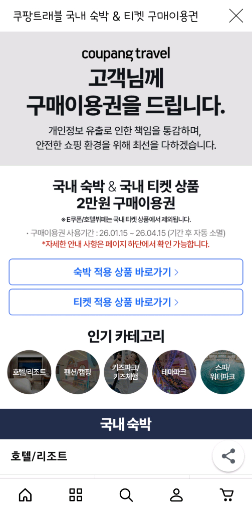 개인정보(거래정보)를 주고받는 행위는 사기에 노출될 수 있으므로 즉시 중고나라로 신고해 주세요쿠팡 트래블 2만원 쿠폰 장당 6천원에 판매합니다. 차액 +6천원 보내주시면 대리 주문 해드려요~ 와우 가능 구매 후 환불 불가