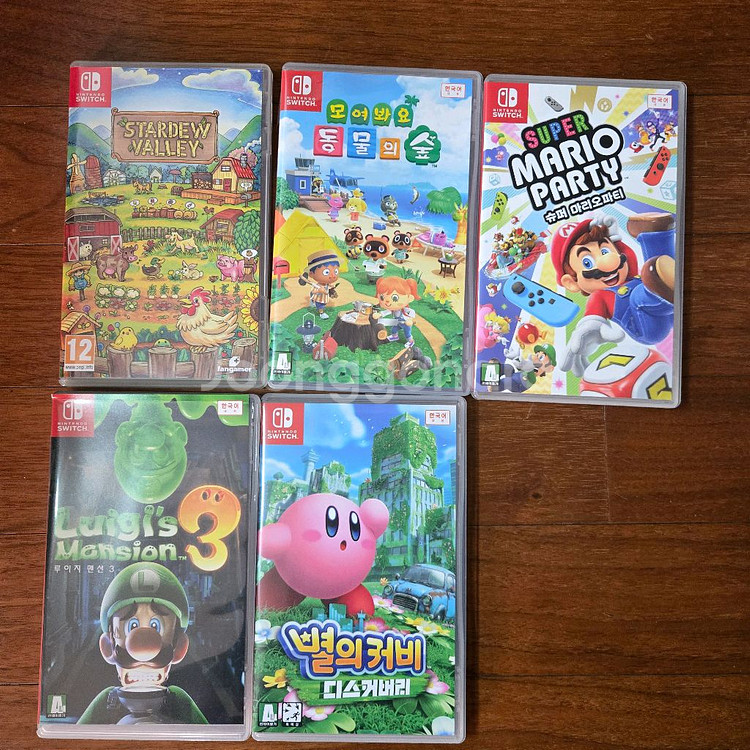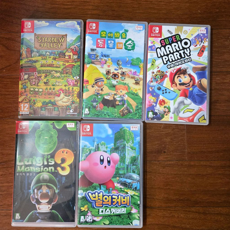 닌텐도 스위치 게임 5종 판매합니다. -스타듀밸리 55,000원 -모여봐요 동물의 슢 45,000원 -슈퍼마리오파티 40,,000원(판매완료) -루이지 맨션3 42,000원 -별의커비 디스커버리 45,000원 정상작동 잘 되고 하자는 없습니다. 일괄로 구매하시면 네고해드립니다. 연락주세요😄